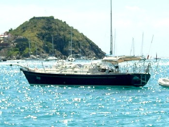 In thirty knot winds and a seascape of seven to nine and an occasional twelve to fifteen foot waves, we sailed north of Anguilla and cut between the mainland and Scrub Island. The fifteen footers were the type that pick you up and set you down gently most of the time. The occasional rogue wave will wipe the deck clean of anything that is not tied down and fortunately everything is, after the first one. We sailed to Ile Tintamarre for a night and then on into Gustavia, Saint Barthelemy or St Barth for short. This little beauty is administrated by the French. To give you an idea about clearing in and out, we first raised the yellow "Q" flag which means we are quarantined until clearing, then dinghied to customs and immigration with passports and boat documentation in hand. Usually we would wait until the next morning if we had arrived later in the day but in this case we had plenty of time due to the high winds. St Barth's customs was most friendly which is not always what we have found at other customs and immigration locations. With a plethora of forms and always one or more questions you can't answer without referencing some document you left back on the boat, we paid 8.00 per night in Euros only, necessitating a trip to the ATM before the clearing was complete. In the case of St Barth they collect up front. Back at the boat we lower the "Q" and raise the French courtesy flag. We will need to clear out when we leave and in many places you can do that the day before.