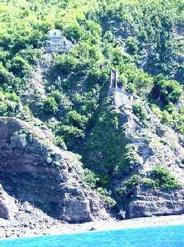 Sylvester, our taxi driver, gave us a quick tour of the island and in no time we had visited all four villages. He then dropped us off in the village of Windward side for our moronic climb . The taxi ride was on "the road that couldn't be built". It seems that Dutch engineers surveyed Saba and declared that roads could not be built on such steep terrain. One industrious Sabaen, Josephus Hassell took a correspondence course on road building and today there is a system of roads in testimony to the hard working indigenous population. The road is very narrow and in some places extremely steep. You really need to be on the island to appreciate it. The Sabans did the same for the airport. Once again the Dutch engineers were very disparaging about the idea of an airport. The Sabans brought in a pilot from St Barts, Remy de Haenen, to look over the one flat rock and he thought landing might be possible. So the Sabans flattened the area as much as possible by hand, removing big rocks and filling in holes. Remy landed and today they have a small airport. They named that part of the island Hells Gate and from the top of the island looking down the name seemed to be appropriate. The island is part of the Dutch West Indies or more property the Netherlands Antilles and in recent years has built a thriving scuba diving industry. Since no one really vacations here a great abundance of marine life is found in the surrounding sea. Diving requires a guide thereby helping in the balance of trade for Saba. The second largest industry is medical education. The 250 students of the Saba International School of Medicine comprise 17% of the population of 1400. All the students are from the US but have you ever seen a medical diploma from the Saba International School of Medicine?