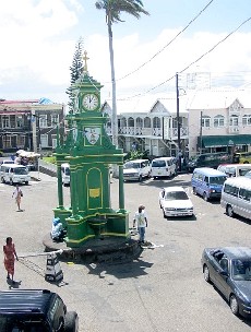 One nice thing about St. Kitts is that you don't have to hike to get to the village. The lower part of the island is green and sloping and they are currently harvesting sugar cane. Basseterre was largely rebuilt after a fire in 1876, and The Circus is "modeled after" (and I use that term loosely) Piccadilly in London. Restaurants and roadside vendors abound.