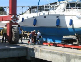 We had the boat hauled during the first week of December to have the bottom painted and a few modifications. The contraption that raised our boat was a "home built " rail system that depended on the tide to raise the boat high enough to sit on the trolley. Last week we watched a boat identical to ours being raised and with a limited amount of confidence we brought our boat to the same boatyard.