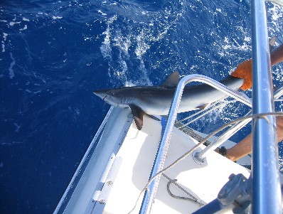 Shark, Shark. These wily creatures populate every part of the ocean and if someone tells you there are no sharks in these waters the only thing you can be sure of is that it's not salt water. The shark's acute sense of smell attracts them to prey and they are most interested in prey that is already in distress. Well, wily or not we found one that hit on our favorite plastic lure. It took Rene almost forty minutes to reel it in. The fight left her exhausted and her arm sore. Okay so now what? Here's this "huge " and I might add stupid, predator thrashing on the side of the boat with my favorite lure hooked into the side of its jaw. We pour about a quart of alcohol into its gills. This technique is used to anesthetize the fish so that I can remove the lure. Yeah right . After another half hour of struggling, the shark is quite and I approach it with my filet knife. I can see my efforts to retrieve the lure will be a futile since it is behind the bony jaw. Suddenly, BAM, the shark lurched at me, its jaws snapping and slashing. I am certain this vicious attack is directed at me personally. The knife blade broke in half and I am up the transom in one leap. Hey, I can buy a new lure. Eventually we gave up the fight for the lure and let the shark swim away.