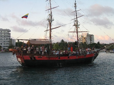 If you ever wondered where your drug money went, well a portion of it is here in San Andres. Colombians holiday on this lovely island to escape the colder climates in the highland and sometimes to escape hectic Carnival activities back home. This week it was Carnival in Blanquilla and the island was full of visitors from that coastal Colombian city enjoying a few days off. While visiting the island, tourists find the party boats a popular attractions. Several times a day these boats load up, well beyond US Coast Guard standards, and head out to a tiny island where those aboard can take a short swim. The adventure takes two or three hours but during our stay the trip was extended a few minutes since the captains enjoyed circling Shira z once or twice. All the boats were outfitted with large sound systems banging away with Bob Marley or other island music. The passengers would wave to us as we were enjoying our sundowners in the cockpit. The brigantine, Captain Morgan was outfitted with dancing entertainment as you can see in the photo.