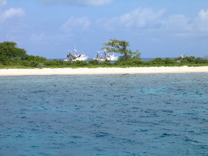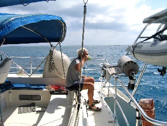 These islands along with most of the islands that surround coastal Central America were settled by British colonists or British pirates and the native language is English. On this island however the tourist trade is primarily Colombian so the predominate language is Spanish. After a few days of relaxing and shopping duty free, we hoisted sail for an uninhabited archipelago, the Vivorillo Islands. It was a beat all the way and we tacked and tacked into head winds of 22 knots. Upon arriving we found the Honduran shrimp fleet anchored around the small islands protected by the coral reef. We had encountered shrimp boats on the night passages as we got closer to Vivorillo and when we arrived late in the afternoon there were twenty or more boats at anchor. It was time for the "factory boat" to meet the fleet and load the catch for the trip to port. After we anchored we were visited by Anthony and Lydia who live on a small neighboring island during the fishing season and in their small launch dove for lobster, collected conch, and caught fish to sell to the factory boat. This idyllic setting was spoiled by the flies that showed up every time we tried to cook something. Anthony explained that the shrimpers often get fish and shark in their nets. The sharks are shot immediatel y to save damage to the net and the fish are processed but the offal is not dumped overboard for fear of attracting more sharks and therefore more damage to the nets. Instead the remains are hauled off to the small island and dumped, thereby attracting a great number of flies. We were told that the problem exacerbates at the end of the month so any thought of hanging around was quickly dispelled and we had the anchor up the next morning headed for La Ceiba. During the first nights passage we again encountered the shrimp fleet.. At one time we could see the lights of ten boats in the surrounding water. The trick is to tell which direction and approximately how close they were. Rene did a wonderful job as I was down below sleeping to prepare myself to the midnight to six am shift.