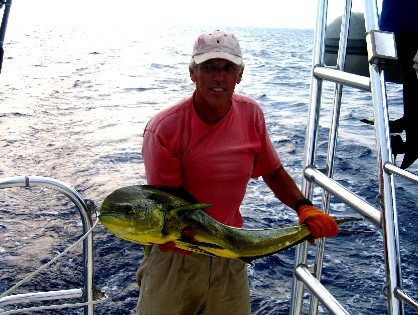 One thing we do to while away the hours during a long passage is to fish. Fishing on a sailboat gives you plenty of excuses for not catching fish since you are either going too fast or too slow. Take for example during the days when there is not enough wind to sail and we are motoring against the Gulf Stream. The only fish I saw was the one who took one of my new lures while I was cranking in the bait for the evening. Only then was the bait going fast enough to attract a game fish. It hit within a few feet of the boat and broke the 50 lb. test line. Needless to say it was huge. And then there was the other day when I caught a nice size dolphin at dusk when a herd (I always thought it was a pod but not according to our book of fish and whales) of pilot whales surprised us just after we took this picture. There were too many to count and one of these 18 foot babies breached within twelve feet of the boat. The next thing I saw was the "catch of the day" sliding off the transom. Well, we were excited. Sorry, no pictures of the pilot whales.