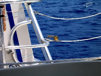 On most of our extended passages we end up with a migratory bird onboard, usually something small like a finch or swallow. We are torn on whether to allow the bird to stay onboard and end up a hundred miles from its migratory path or to chase it off . They always appear so exhausted that we allow them to hitch a ride and hope for the best. It also seems that once we allow one onboard a second always shows up. We don't know the fate of this small fellow. Perhaps my friend Gary Reed can identify it for us?