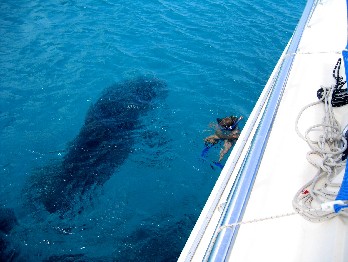 Well enough back patting. On the we ekends Spanish Waters is full of sail boarders, day sailors, power boaters and the nearby beaches are populated but certainly not crowded. The wind blows most of the time with occasional gust to 35 knots. We do go swimming at the local beaches when the wind doesn't blow like stink and when we have the time. It seems that schooling is taking up lots more of our time than when we started out. Santa Barbara is the beach we use for swimming. It is private but for now the area is under development and anyone with a boat can tie up to the buoys that mark the swimming area of this beautiful white sandy beach. There are several other places to snorkel and dive within the distance of a dinghy ride. One with a sunken tug in 20 ft of water is surrounded by beautiful fish and coral and this location keeps us entertained about once a week. As you snorkel near the tug a large array of fish come to greet you since they have been abundantly fed by previous divers and snorkelers. The parrot fish in the area are neon blue and this surreal color makes you think they are there to advertise something.
