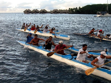 We were anchored off the marina Tahini and during all daylight hours paddlers were practicing in outriggers. The canoes are configured to hold anywhere from one man up to eight. We also saw practice for a relay race where a crew change was accomplished. A relief crew of four treaded water and after the primary crew jumped overboard they lifted themselves aboard and headed out. And all of this was done in synch and very quickly.