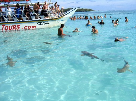 A little further down the channel is a sand bar where the sting rays gather to be fed by visitors to the island. On our first visit there were only a few tourists. It was the kind of close encounter with nature that you would like to think of as a gift for having traveled so far. We forgot to bring our camera so we weren't preoccupied with the right shot but only with enjoying the moment. However the next day, we returned with camera in hand and while we were there tw o large tour boats pulled in and it became a different type of experience. There were still thirty or so sting rays swimming about looking to be fed but now they were joined by at least ten black tipped sharks in the periphery. Attracted by the activity and food in the water, the sharks (large sharks) would swim within three feet of us. We got back in our dinghy and watched the antics of the tourists. The "Liki Tiki" tour boat assigned a crew member to herd (?) the sharks to the back of the boat and away from the central location of the tourists. However once the sharks were spotted by the tourist most removed their snorkel gear and went back on the boat to take pictures . A few brave (?) souls actually headed toward the sharks with food in hand.. Without incident everyone soon departed and we were left with just the beauty of the place and the rays while the sharks returned to the deeper water. These larger boats come on Monday, Wednesday, and Fridays so you have a choice.